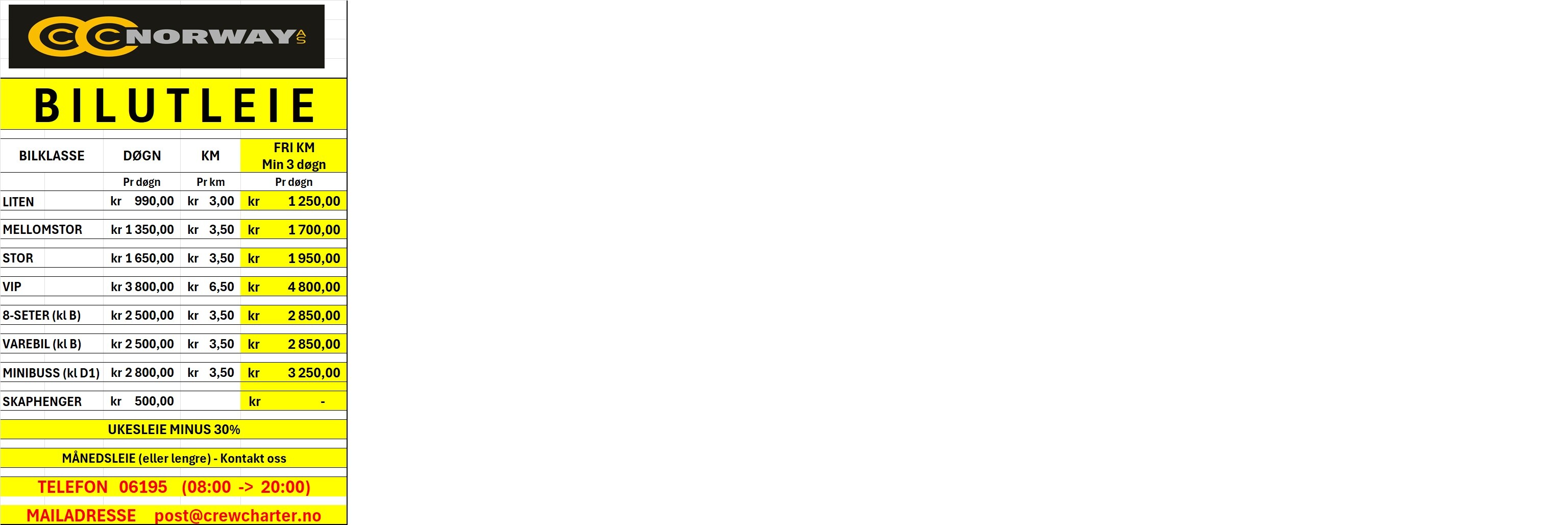 Vi har flere ulike typer kjøretøy, både personbiler minibusser og varebiler for utleie. Vi utvider fortløpende vår utleiepark etter våre kunders behov og etterspørsel. Trykk på bildet for info om priser.